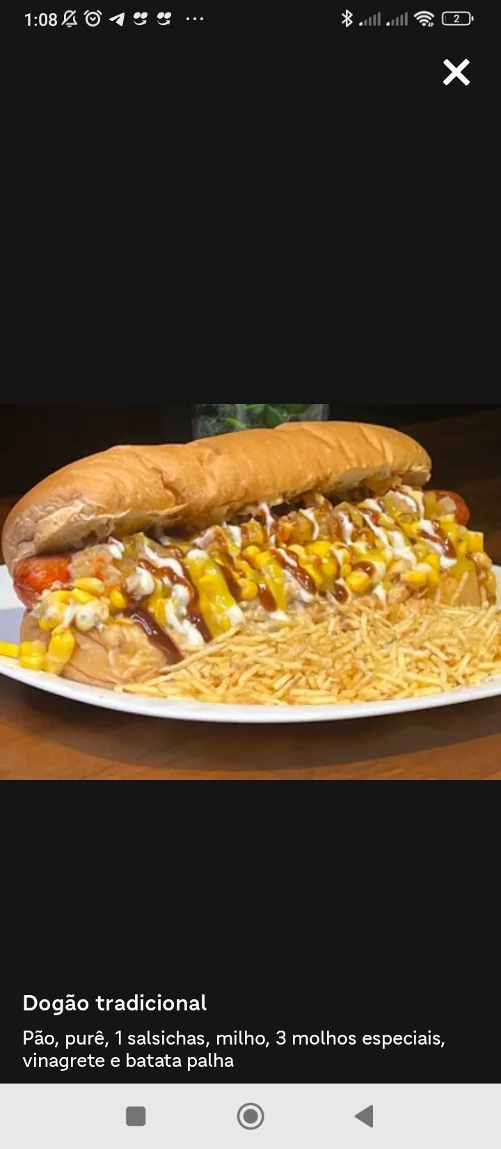 Pão, Purê, 2 salsichas, Milho, vinagrete, batata palha, 3 molhos